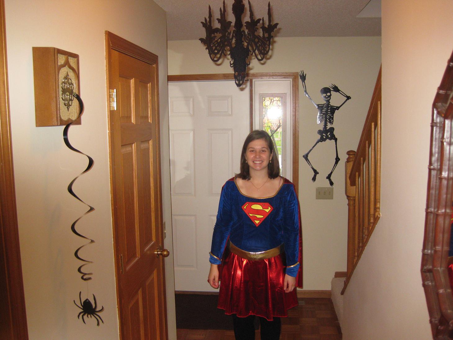 My wife, Betsy, rocking the Supergirl costume. The skeleton’s diggin’ it too.