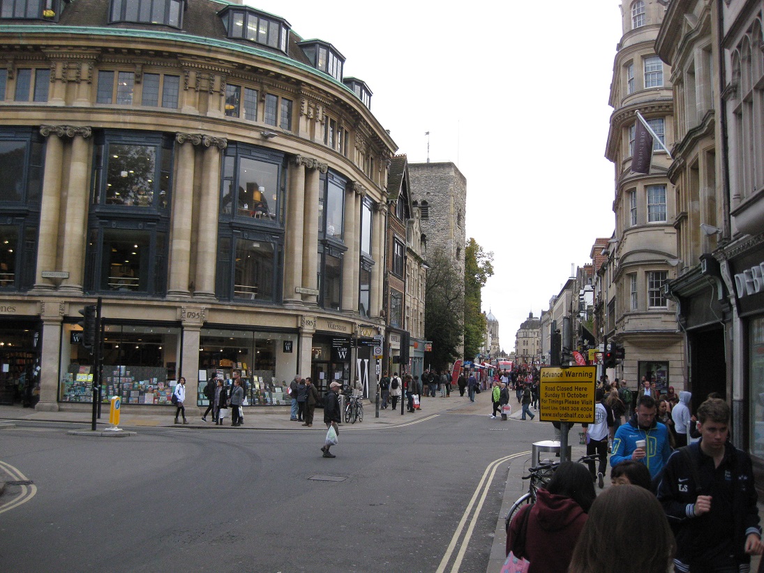 A typical street scene in Oxford, near our hotel. That’s Waterstones book store on the left. Oxford is very much a walking city, with many whole streets set aside for pedestrians. I was surprised at the sheer volume of foot traffic. Getting around in the city consists largely of dodging other people – which is tricky, because they’re also trying to dodge you, and if you both dodge in the same direction, then neither of you has dodged anything and you have to try again.