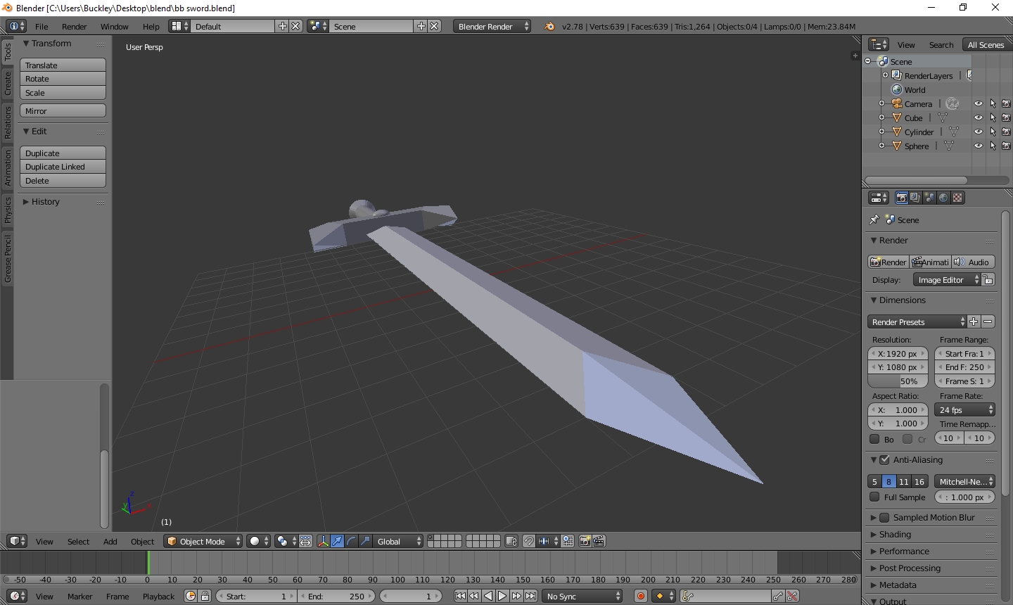 1. Looks really good. I haven’t gotten that much into blender either, but I was having troubles with the curved wires on the rigging for the zeppelin I was making. Did you make the blade out of one piece? or is it multiple pieces glued together?
