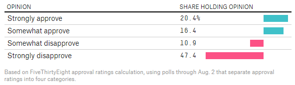 FiveThirtyEight keeps track of the President’s approval and disapproval ratings using a statistical model that looks at a lot of different polls. Here’s what it shows right now: