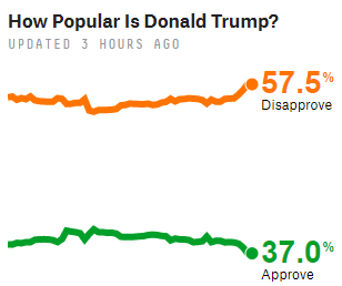 37% approval rating, 57.5% disapproval. As for the trend, you can’t tell from that screenshot (which covers a fairly short time span), but approval has been dropping slowly but steadily ever since he took office. 37% is the lowest it’s ever been.