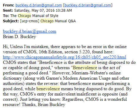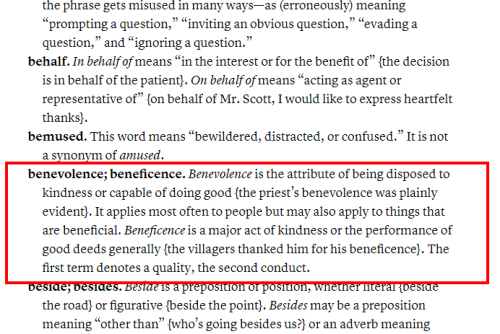 In the course of my reading and note-taking, I came across section 5.220, which clarifies the usage of some commonly misused words. Among them were benevolence and beneficence: