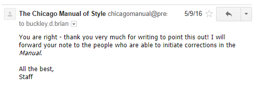 Nothing new happened for a while. And then, about a month ago, a new (17th) edition of Chicago came out. And in the section on word usage (now renumbered as section 5.250) we find: