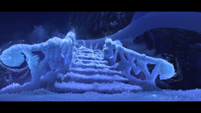 Watch — as she runs across the bridge, she’ll continue to do this snow-to-ice trick in midair. It reminds me of the scene in X-Men where Magneto builds a bridge from flying metal as he walks calmly over an abyss.