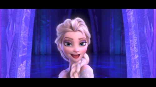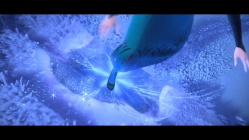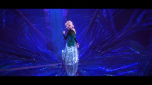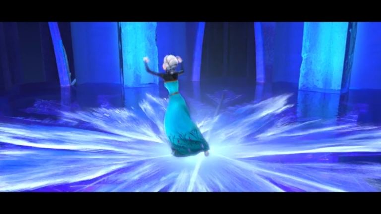 Also — look at her face. Look at how happy she is. We talk about someone “taking power” or “seizing power” or “holding power,” all of which suggest strong effort. But Elsa, as the title suggests, gains power by finally, finally releasing her grip. She hasn’t felt freedom and joy like this since her very first scene with Anna, near the start of the movie. It’s just cool to watch (not to mention the outstanding special effects and the lighting).