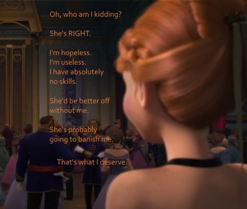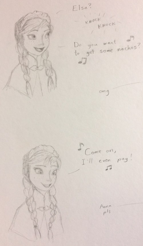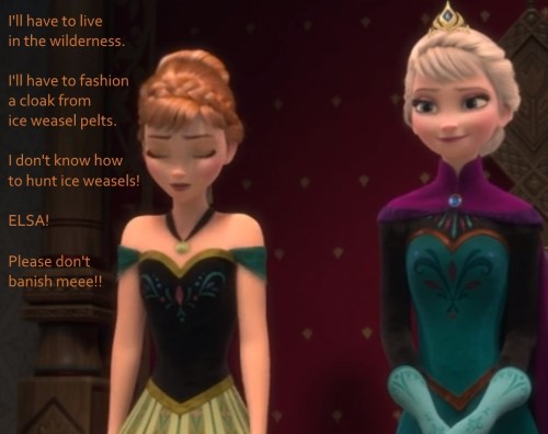 In the movie, we cut back to Anna’s journey now, but I can’t help but imagine what it’s like for Elsa immediately afterward. Her power jam complete, she’s back inside her crystal palace, and she … what? Builds some ice furniture? Plays some snowy solitaire? Picks up that crown she threw away before? Oh, and incidentally, what about that whole “food” thing? (I won’t speculate on the logistics of ice toilets.)